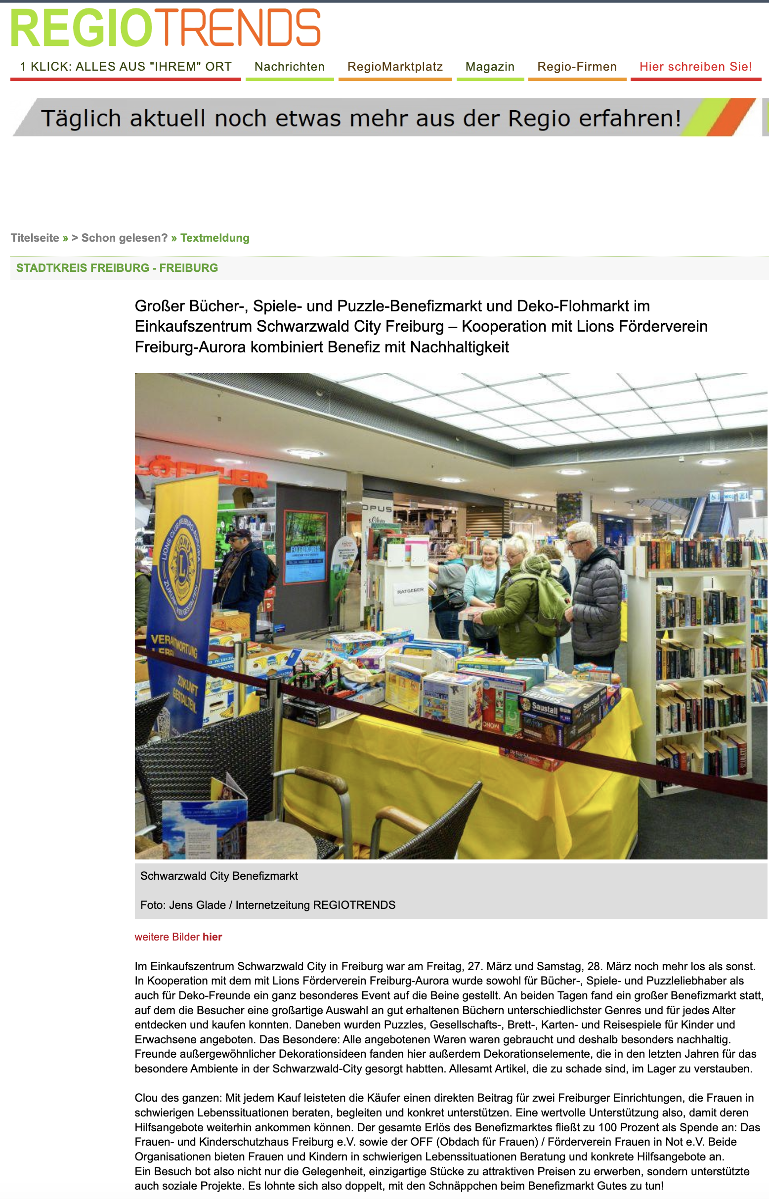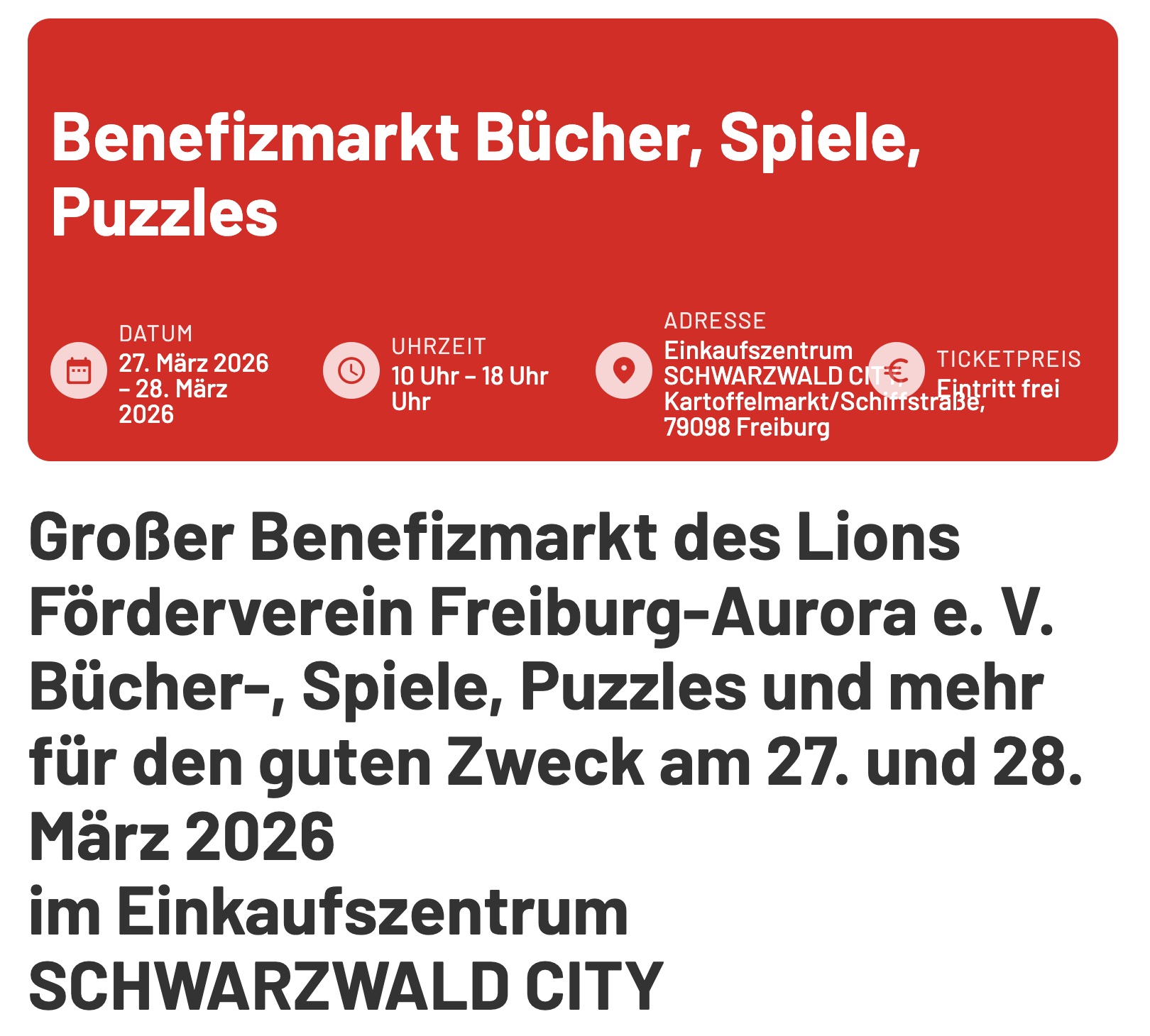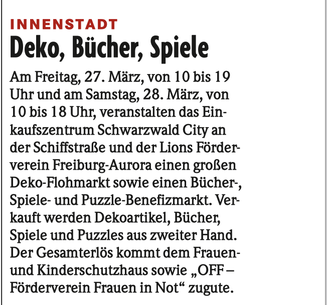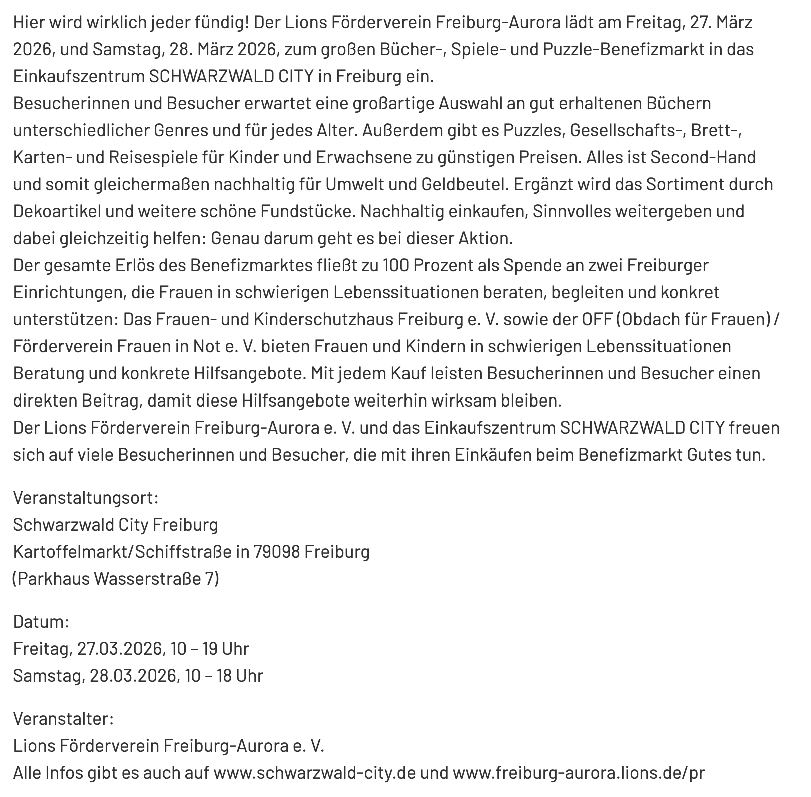 Hier wurde wirklich jeder fündig! Unser Lions Förderverein Freiburg-Aurora lud am Freitag, 27. März 2026, und Samstag, 28. März 2026, zum großen Bücher-, Spiele- und Puzzle-Benefizmarkt sowie einem Deko-Flohmarkt in das Einkaufszentrum SCHWARZWALD CITY in Freiburg ein.