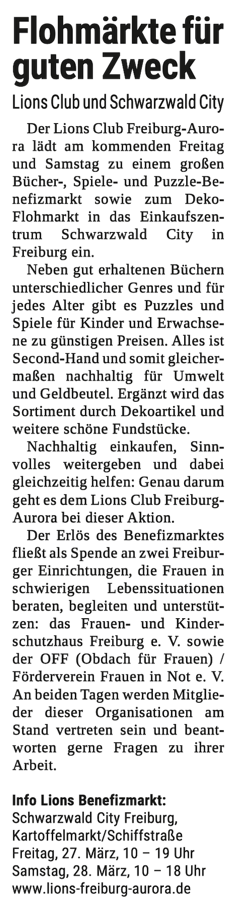 Großer Benefizmarkt des Lions Förderverein Freiburg-Aurora e. V.